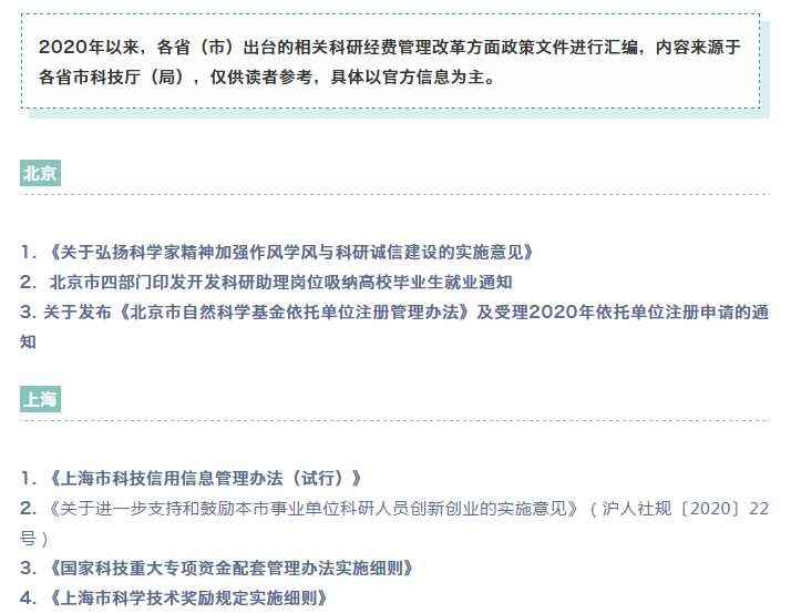 2020年以来,各省(市)出台的相关科研经费管理改革方面政策文件进行汇编,内容来源于各省市科技厅(局),仅供读者参考,具体以官方信息为主。北京1. 《关于弘扬科学家精神加强作风学风与科研诚信...